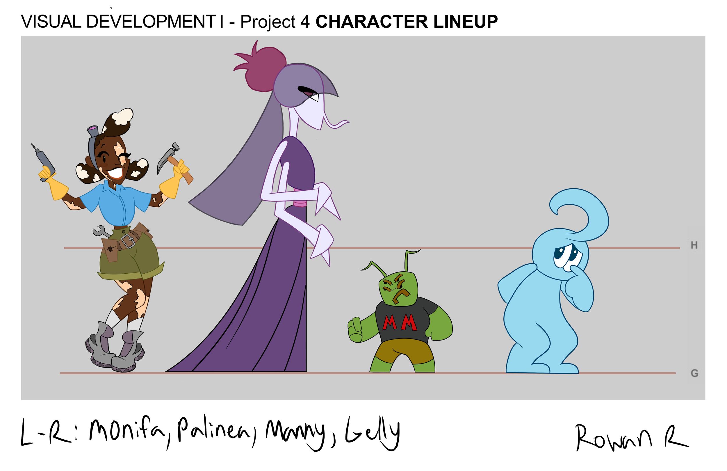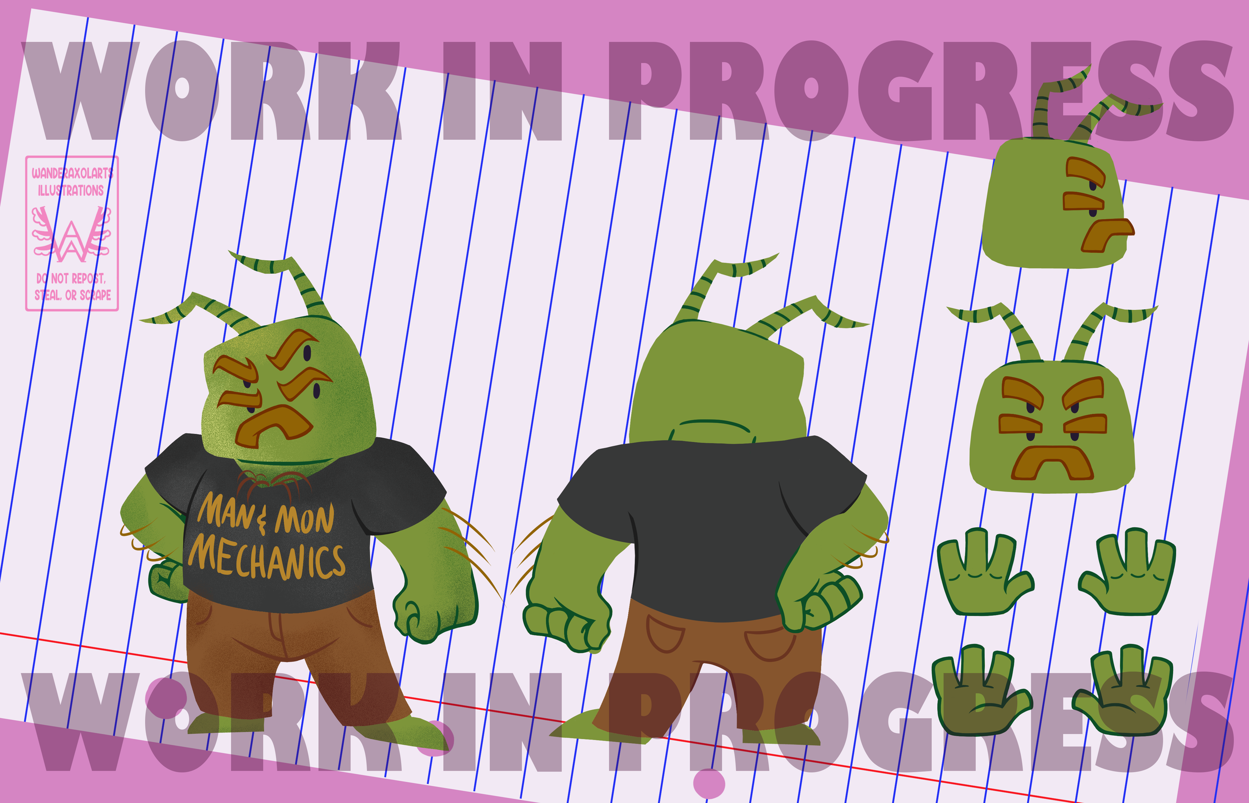 Stemming from a VisDev project and my Hullabaloo comic, these characters are part of an idea for a sci-fi romcom comic I plan on developing. It would follow Monifa, the main protagonist, and her life running a mechanic shop with her dad Manny at a giant space station, all while sporting a crush on a cute biker mantis named Palinea and dealing with regulars like Gelly.