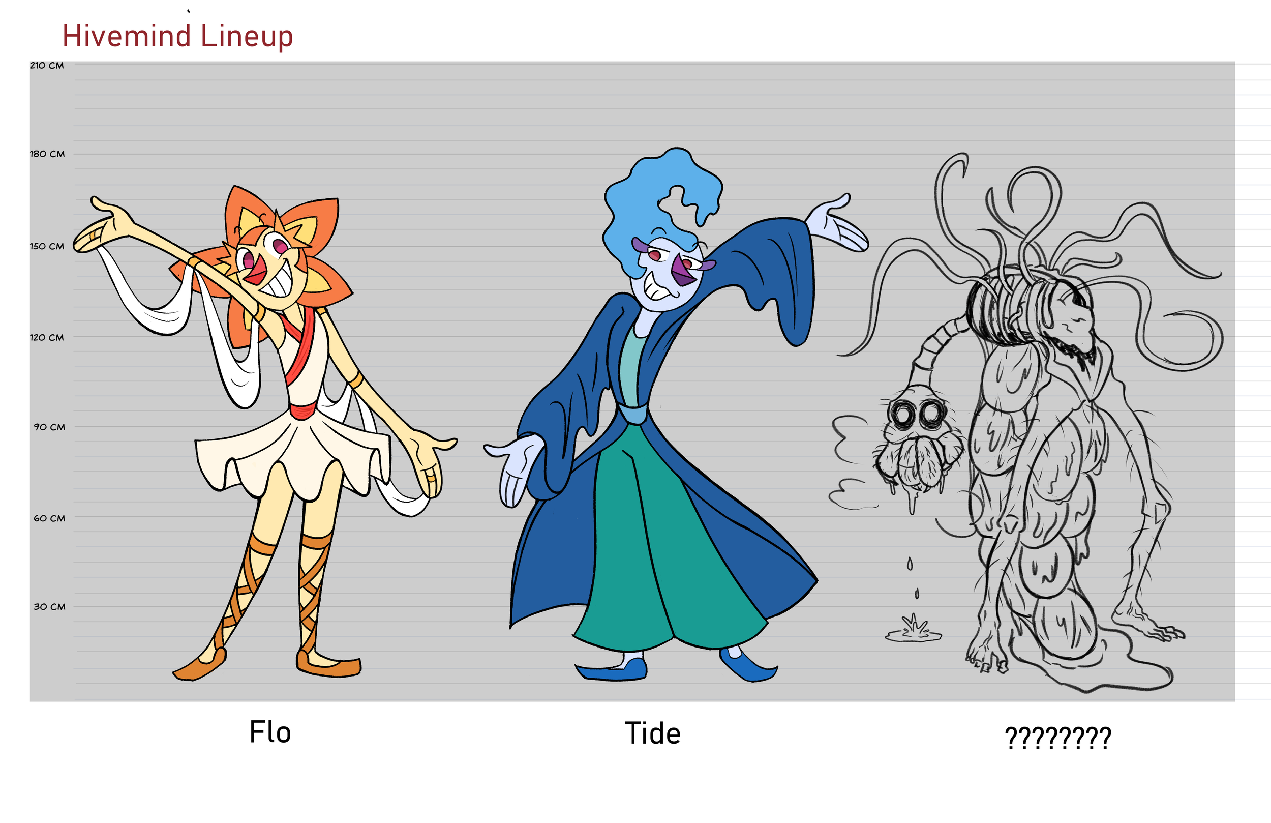 Planned redesigns for Hivemind cast. From left to right: Flo, Tide.